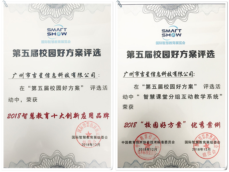 吉星信息科技在教育設備領域的深耕細作以及對教育行業(yè)用戶的大量成功服務經(jīng)驗,被“國際智慧教育展組委會”授予“2018智慧教育十大創(chuàng)新應用品牌”。
