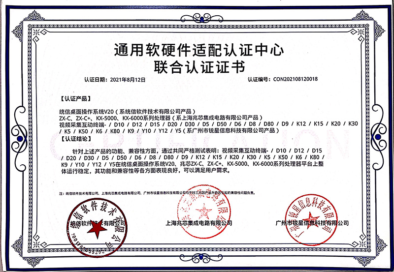 兆芯認證證書(無線視頻展臺、視頻采集互動終端)
