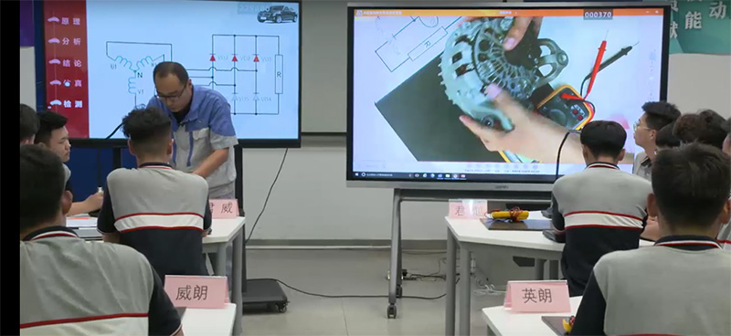 在強交互實訓課堂中,跨區域教學是重點。在展會上,工作人員會演示相隔距離的異地教學,展示不同時間空間的同步課堂。