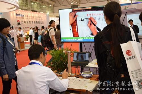 其中,“展示互動書法教學”成了大家圍觀的焦點。展示互動書法教學,即課堂上老師在無線展臺下進行書法過程展示,畫面通過無線WiFi傳輸到大屏幕,大家可以通過清晰地觀察老師的執筆方式、筆鋒走向和字體結構,進行同步臨摹學習。