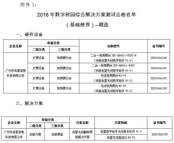 2015年12月24日,吉星無線視頻展和二合一視頻展臺(tái)等多款硬件設(shè)備和一個(gè)教學(xué)創(chuàng)新方案“吉星無線翻轉(zhuǎn)課堂解決方案”在眾多送測(cè)產(chǎn)品和方案中脫穎而出,成功通過了中央電教館2016年“數(shù)字校園綜合解決方案”檢測(cè)并將獲得證書,可參加各地區(qū)相關(guān)“數(shù)字校園解決方案”招標(biāo)項(xiàng)目。